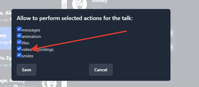 Also if you are admin or talk's owner, you can use Settings option from right top menu of the talk. It allows to disable Video recorder for special talks for all its participants even they are have permission to create video records.