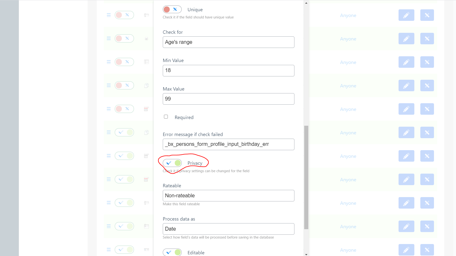 here u see a ll fields and can manage this - if u want that users can set the privacy, than open e.eg Birthday and set the Privacy settings like my