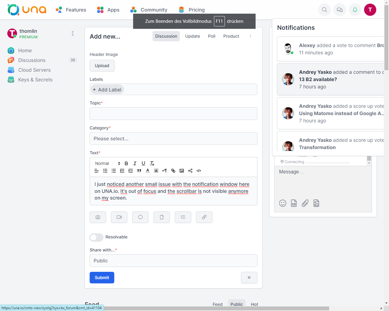 I just noticed a small issue with the notification window here on UNA.io. It's out of focus and the scrollbar is not visible anymore on my screen. Please have a look at the attached screenshot.