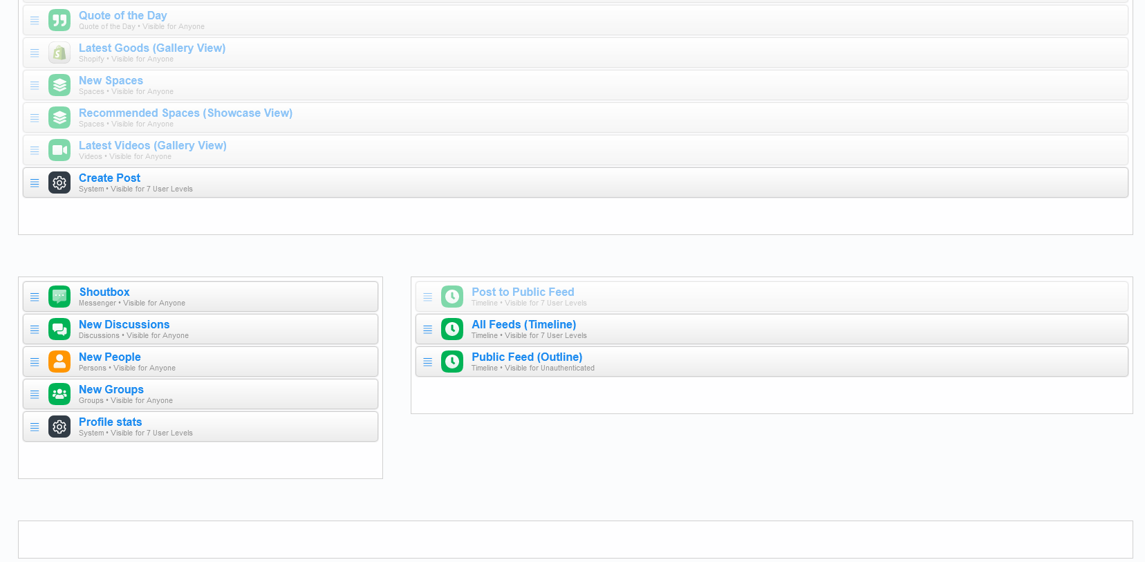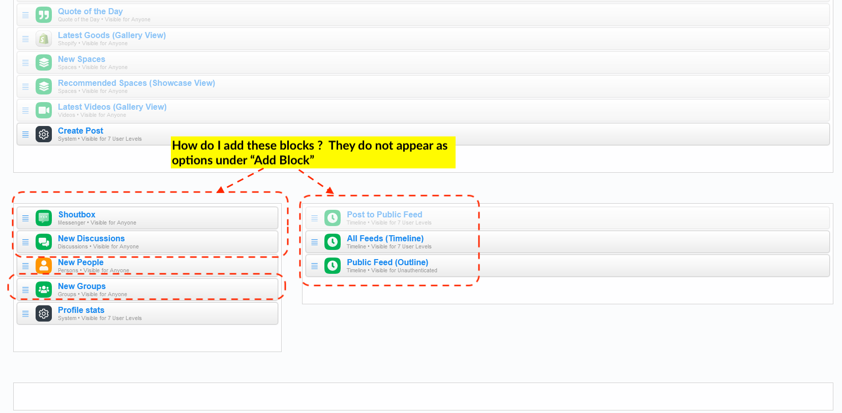 2. But when i select "Add New Block" I do not any block options for Shoutbox, New Discussions, All Feeds, etc.. and the other blocks that you show in your previous examples.