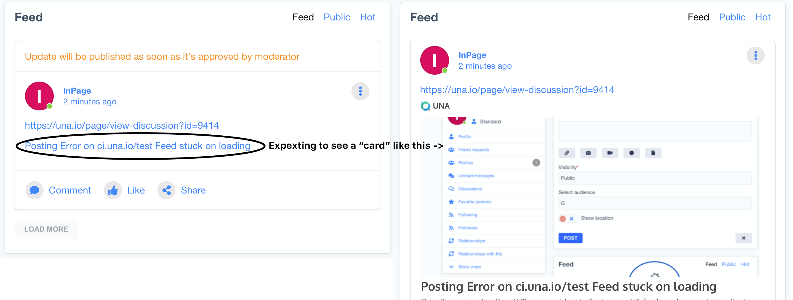 Posting Error on ci.una.io/test Feed stuck on loading