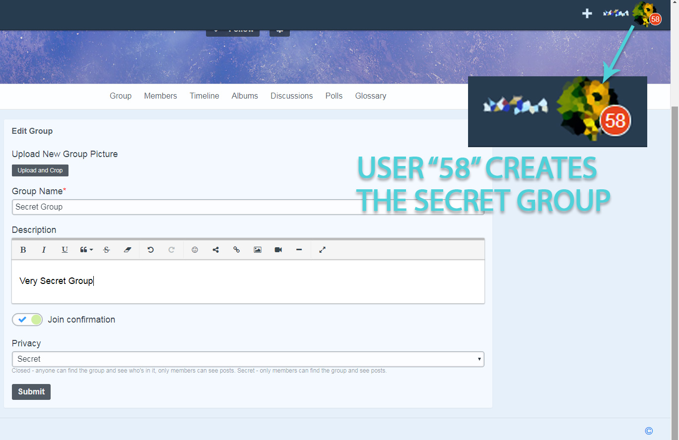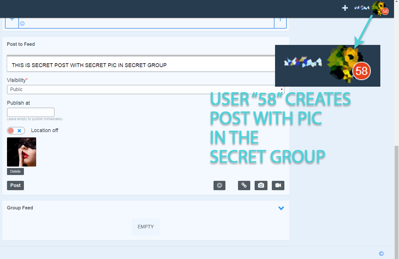 1. User "58" (let's name him so) creates Secret Group with no members, except himself
