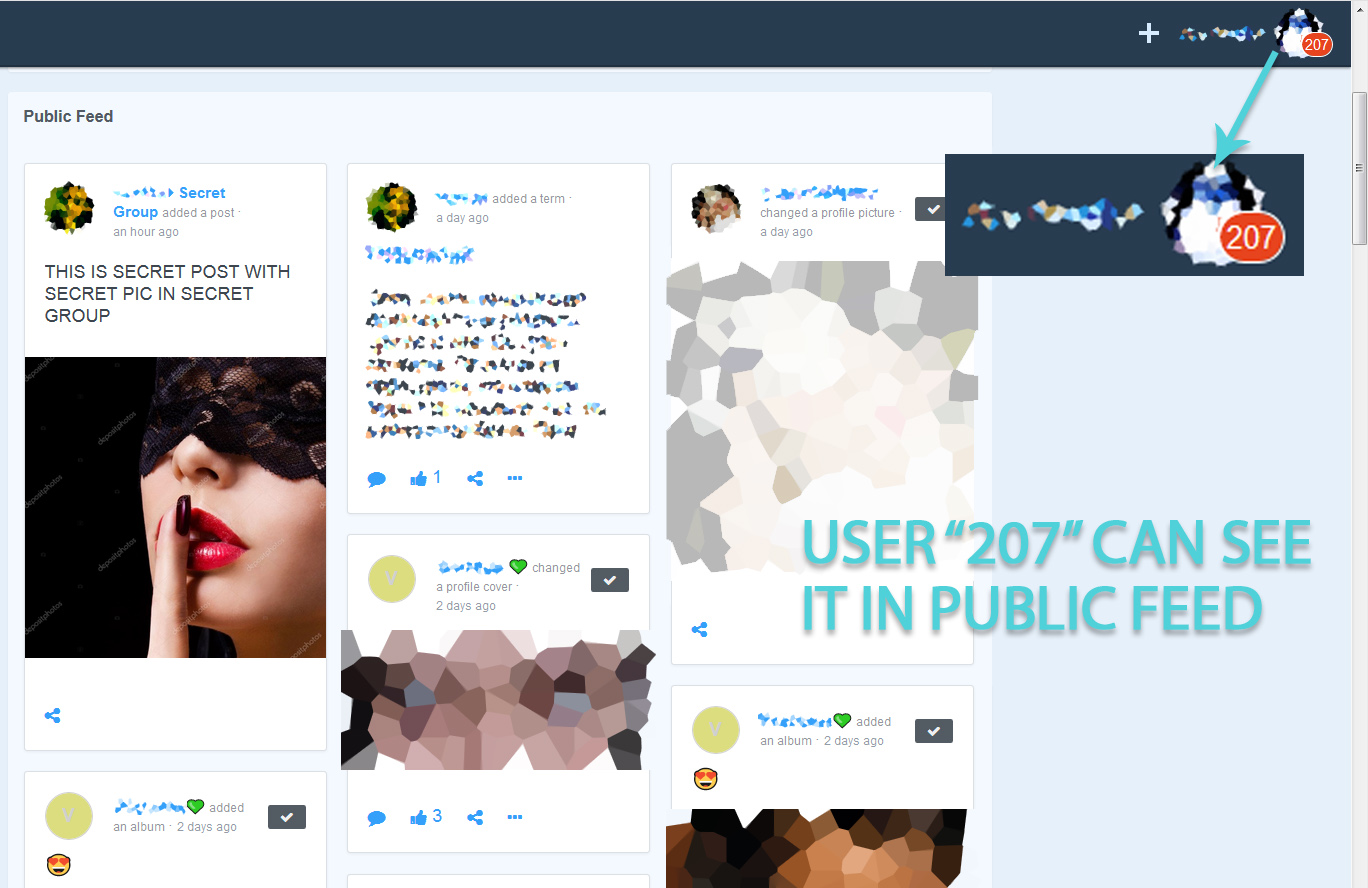 3. User "207" CAN SEE this post in Public Fed, can scroll pictures (if some uploaded) in the feed.