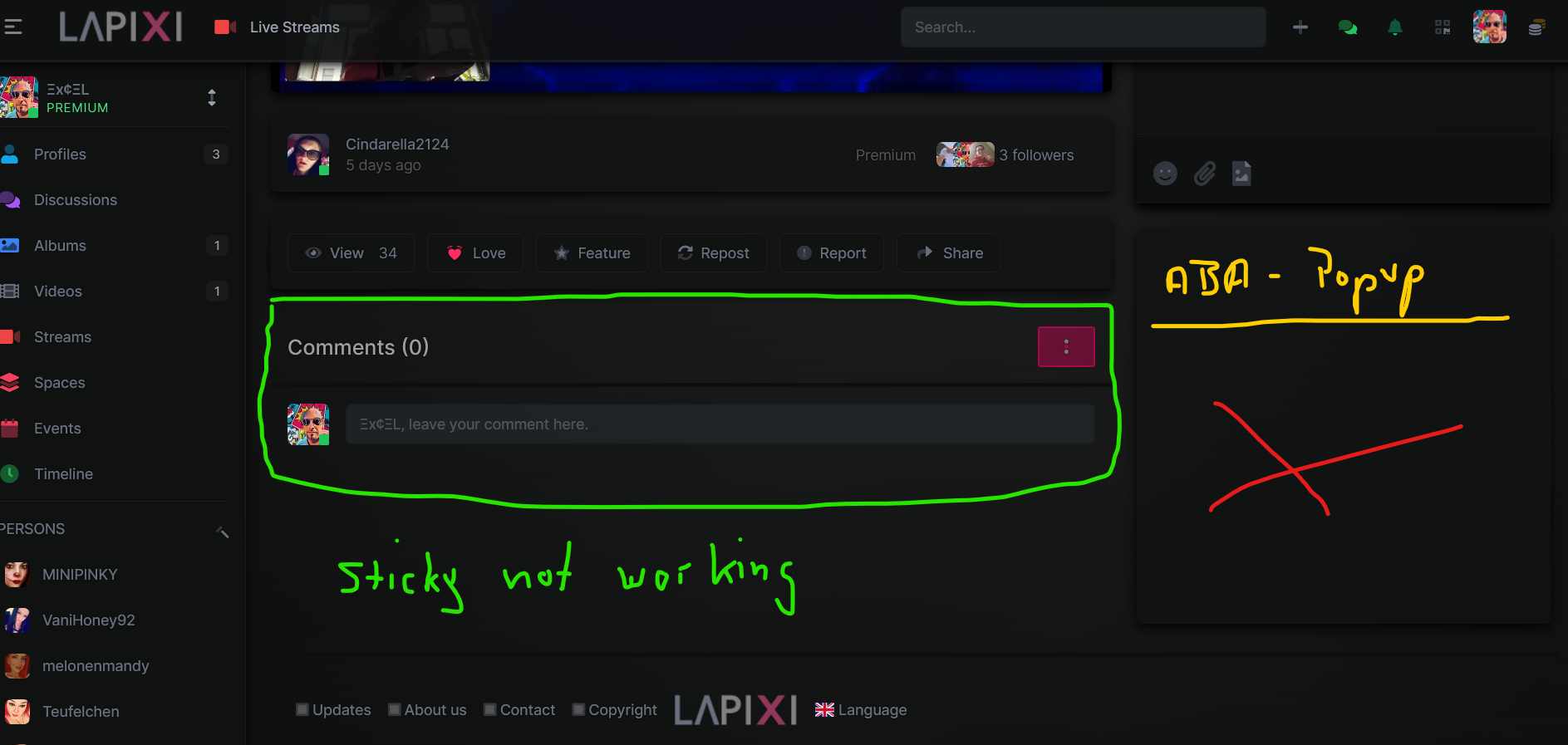 when i insert under the Streming view site the comment box in the last columbe, all is fine and the site is running in Stickymode, but when i set the comment box in the middle left columbe, i lost the Chateditor, the Stickymode of page and the right box (ABA PoPup - Box).