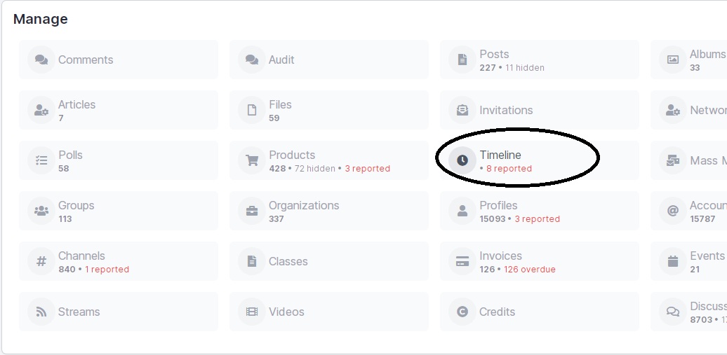 Hello. You may do it via Dashboard -> Manage block -> Timeline or via Dashboard -> Content tab -> Timeline subtab.