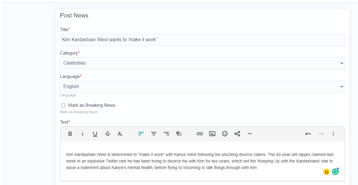 Multi-Language feature - For multi-language sites, it is possible to post news for a particular language. When viewing the site, news will be displayed based on the selected site language.