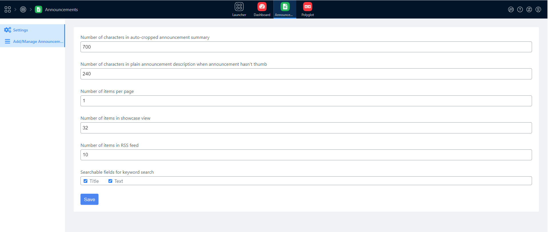 Search functionality allows browsing of Announcements by Keyword.