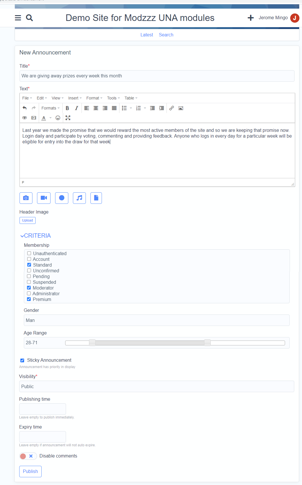 • Location (option to limit announcement to profiles within a particular geographical area)