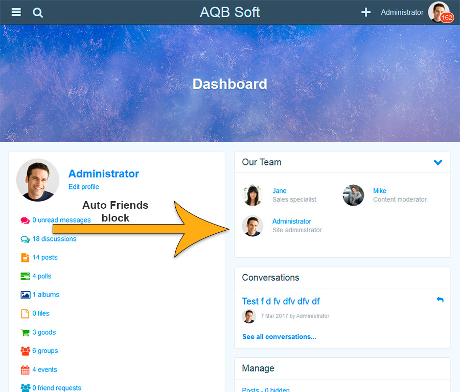 - "Auto friends" block on Home and Dashboard pages. In the aggregate with auto friend's description this block can be used as a reference book to show newly joined members which site member he/she can contact with in different situations. For example you may add 3 profiles in the list: