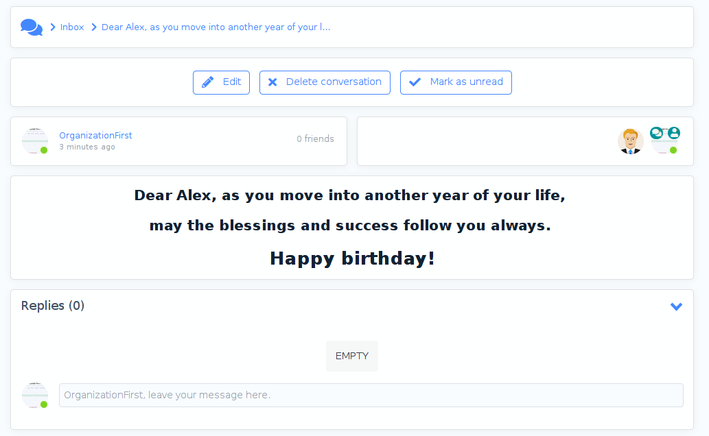 - Allows to send internal auitomated messages directly to the Conversations module.