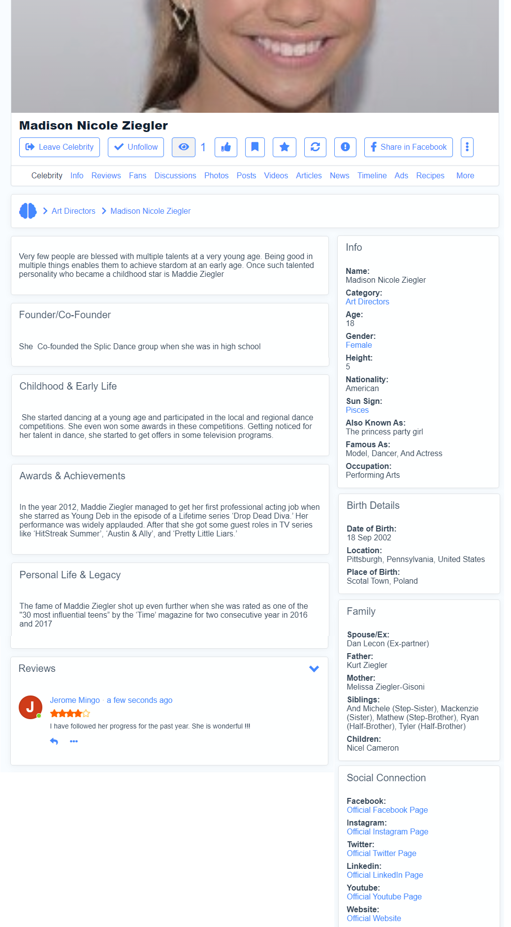 - Displays Social Media Connections (Facebook, Instagram, Twitter etc.).