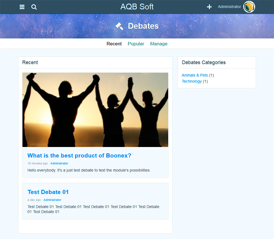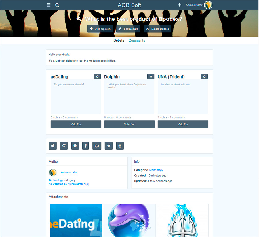 The App adds a new interesting feature on your site. It will allow your users to create debates asking any questions they want to get opinions of the other members for. User may give a number of possible answers (opinions) and the others may agree with one of them and comment it on. The App has different browsing capabilities including a block with the most resent debates on home page. Main features: