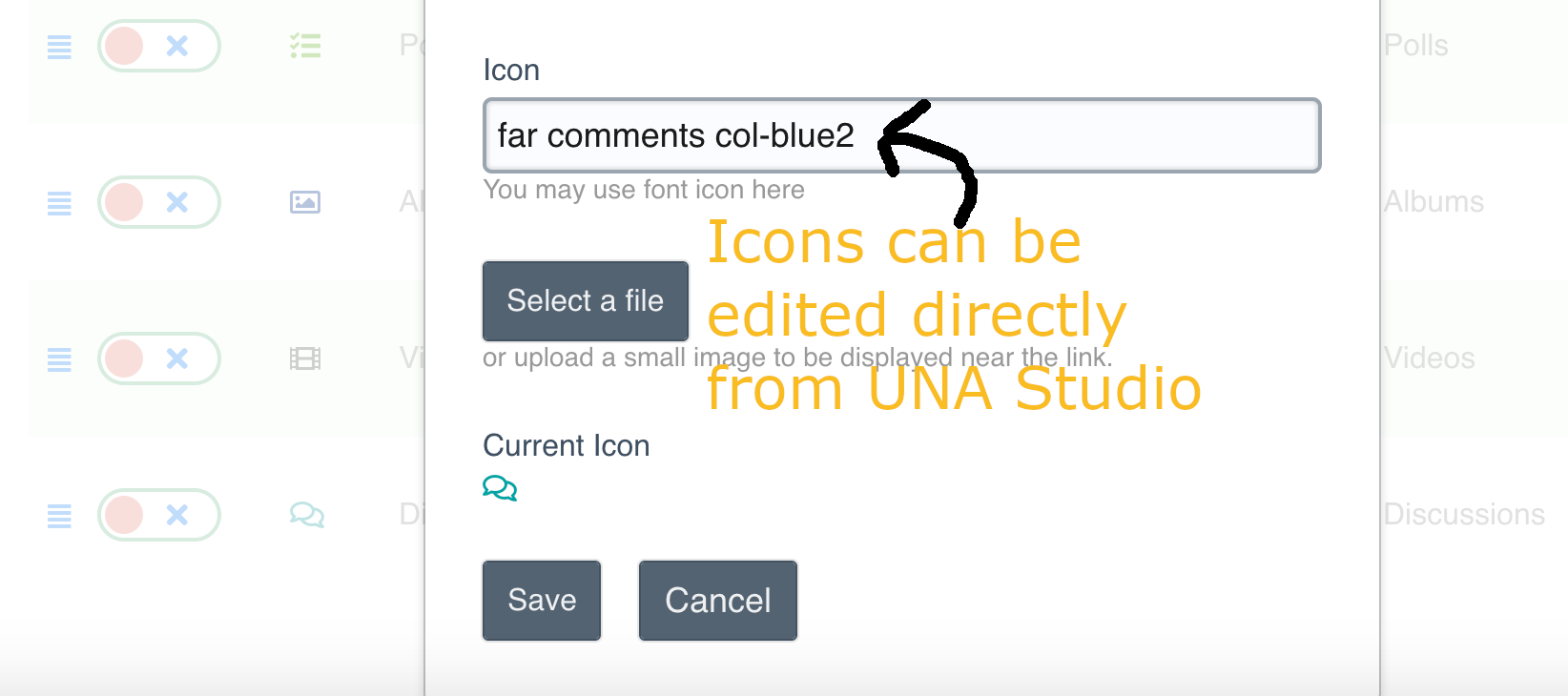 2000+ icons at your fingertips that will freshen up the look of your site and give you a giant repository of icons that used directly within UNA Studio to customize the design of various UNA Modules including Navigations, Permissions & Forms.