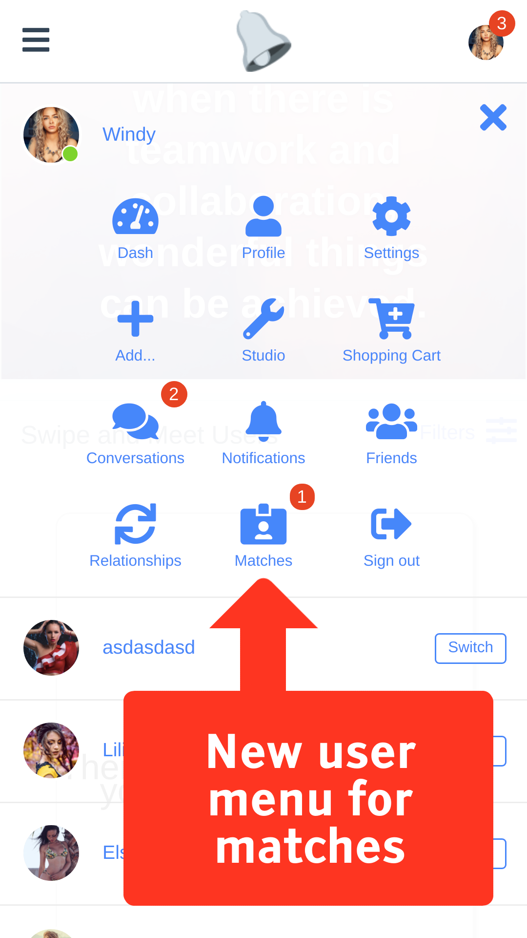 Add a new way to meet people and interact in your social network or dating website. Swipe right to like a profile, if they also swipe right, then it is a match and they can start a conversation* knowing that they liked each other.