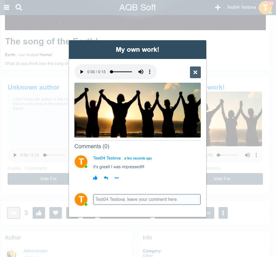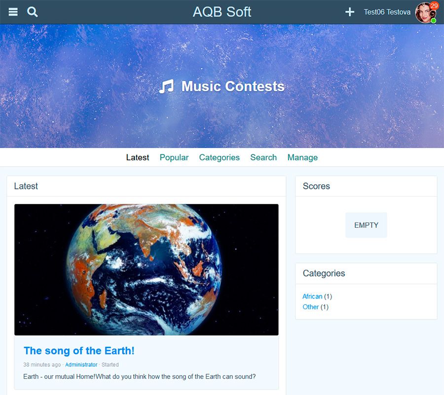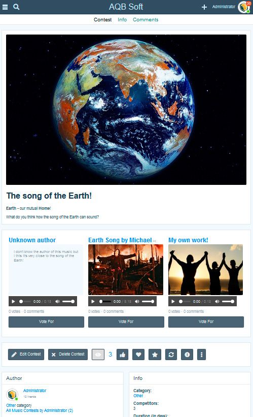 The App adds a new interesting feature on your site. It will allow your users to create music contets. Contest author may not take part in the competition, but if he wants he can became a one of the competitors. A contest may have 2, 3 or 4 competitors. The max number of competitors for the contest is selected by its author during the creation. A contest automatically starts when necessary number of competitors was collected. When contest was started the other site members may vote and/or comment for contest's music. During the contest creation the author should select its duration (in days). The duration starts to decrease immediately after the contest collected necessary number of competitors (started). When duration ends the contest will be automatically finished and competitors collect their scores. Main features: