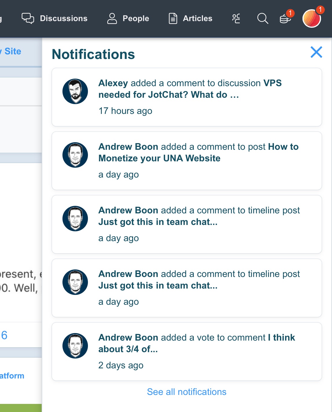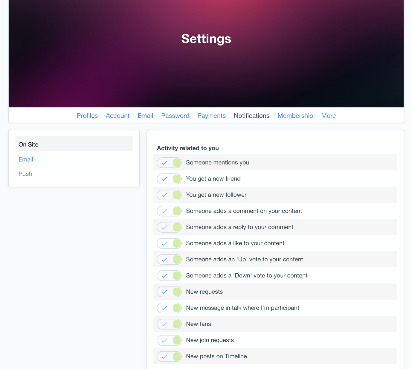 Multiply your community engagement levels - send configurable notifications for all events, actions and reactions. Most UNA modules integrate with the Notifications app, supporting On-Site, Push and Email Notifications.