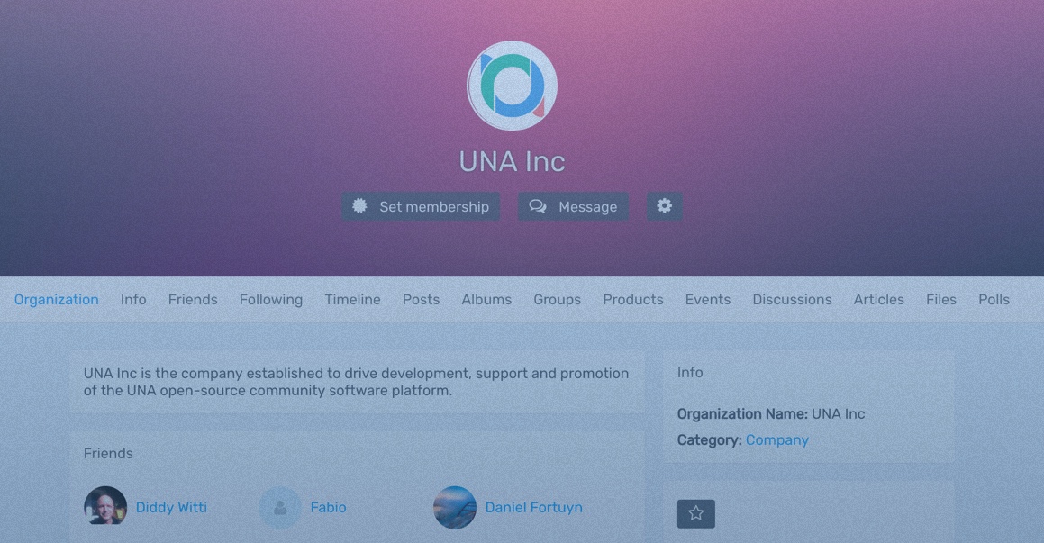 This module is a profile app for Organizations. Users can create public or private company profiles with customisable information fields, profile picture, and cover photo. Works as an on-site identification and placeholder for various additional features provided by other apps (Timeline, Albums, Blogs, etc).