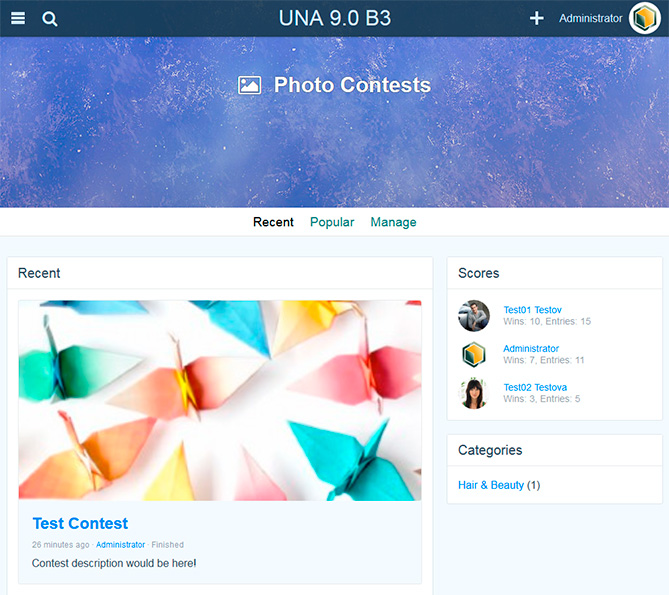 The App adds a new interesting feature on your site. It will allow your users to create photo contets. Contest author may not take part in the competition, but if he wants he can became a one of the competitors. A contest may have 2, 3 or 4 competitors. The max number of competitors for the contest is selected by its author during the creation. A contest automatically starts when necessary number of competitors was collected. When contest was started the other site members may vote and/or comment for contest's photos. During the contest creation the author should select its duration (in days). The duration starts to decrease immediately after the contest collected necessary number of competitors (started). When duration ends the contest will be automatically finished and competitors collect their scores.