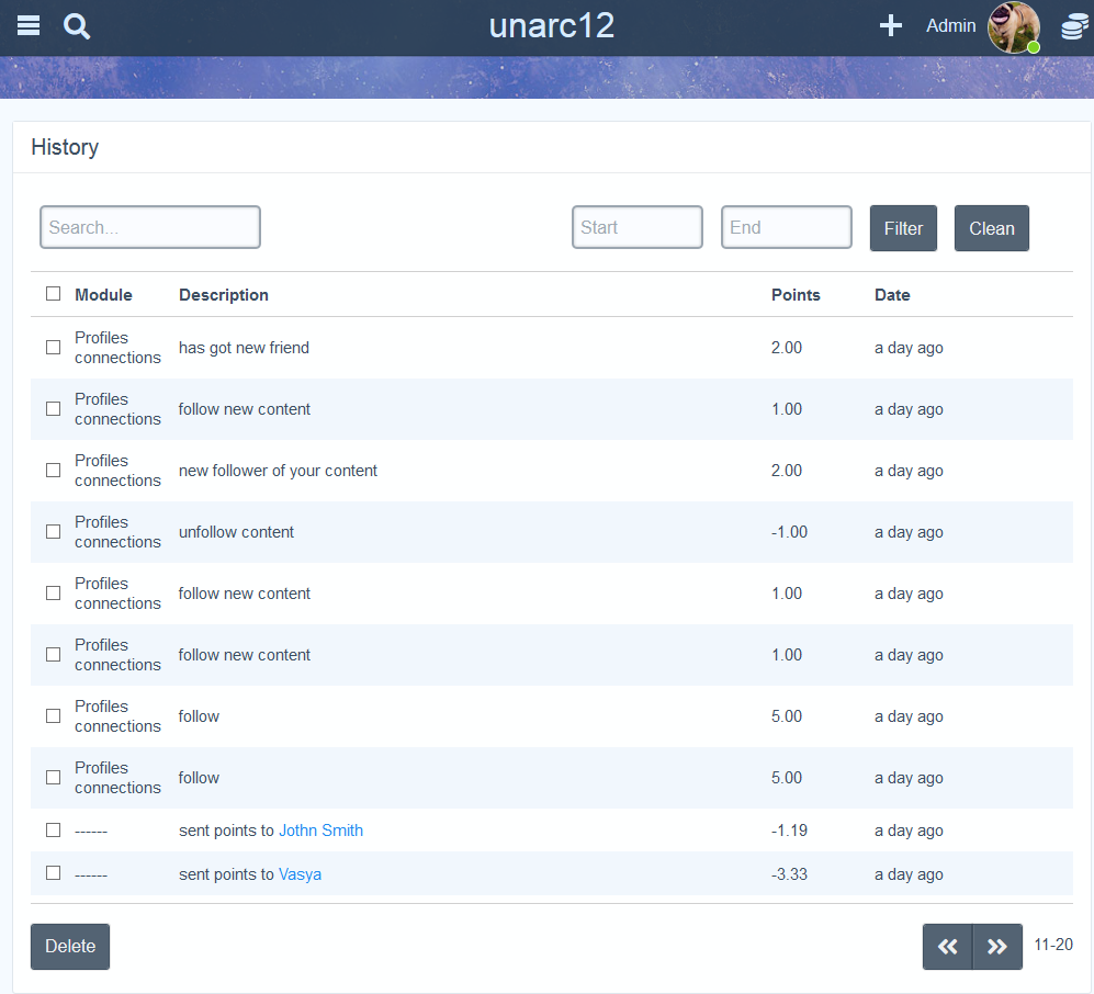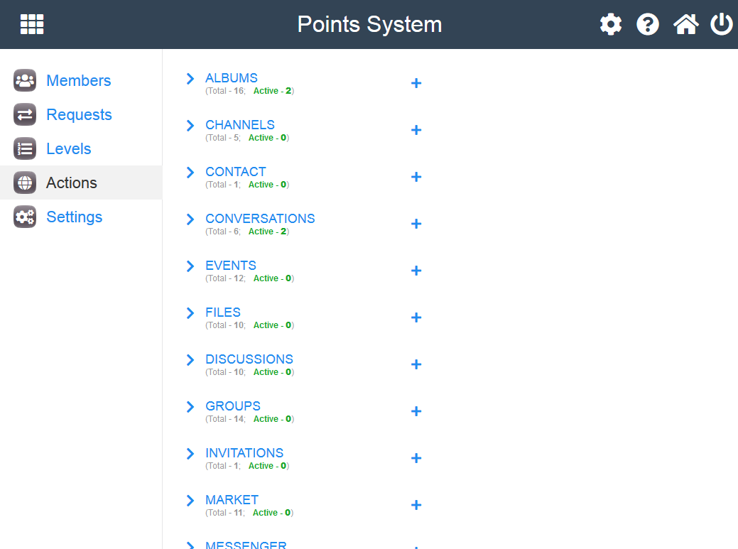 Our latest updates include fixes for studio areas and PHP versions to ensure compatibility with the latest PHP 8.x version. In addition, we have added new language keys for users' activity and now this module provides approximately 460 actions for users to earn points in default UNA modules. If you have third-party modules, there may be additional actions to earn or deduct points.