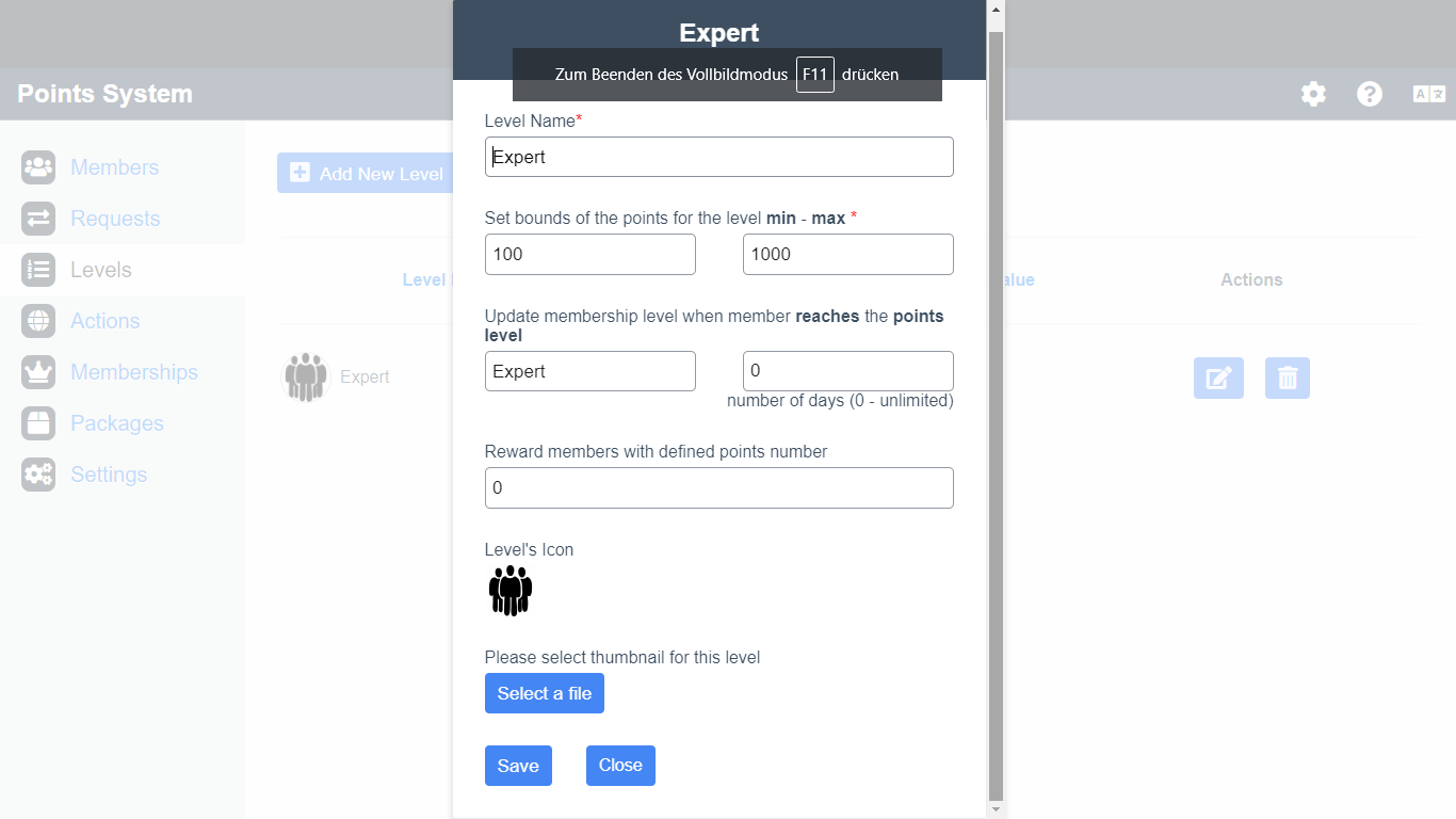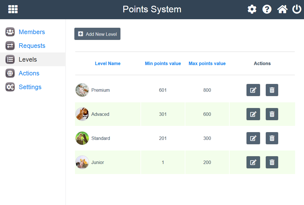 10) Can create any number of point levels with their points' range, names and avatars.