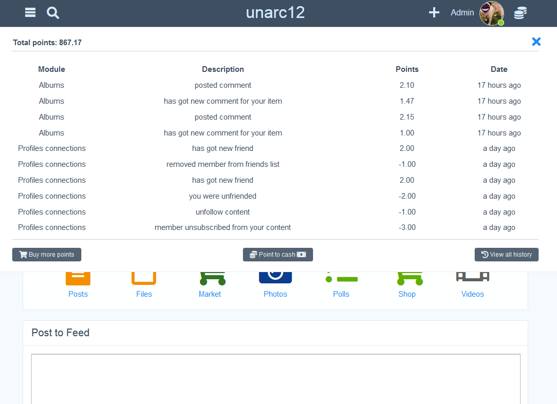 It is flexible and comprehensive system to monetize user's activities. In other words, it allows to reward members with points for their activities. You can guide members' #activity to any part of the site and make them more active in : posting comments, creating posts, voting, sending friends requests, uploading videos, events, etc… Members can also get points levels according to their points balance.