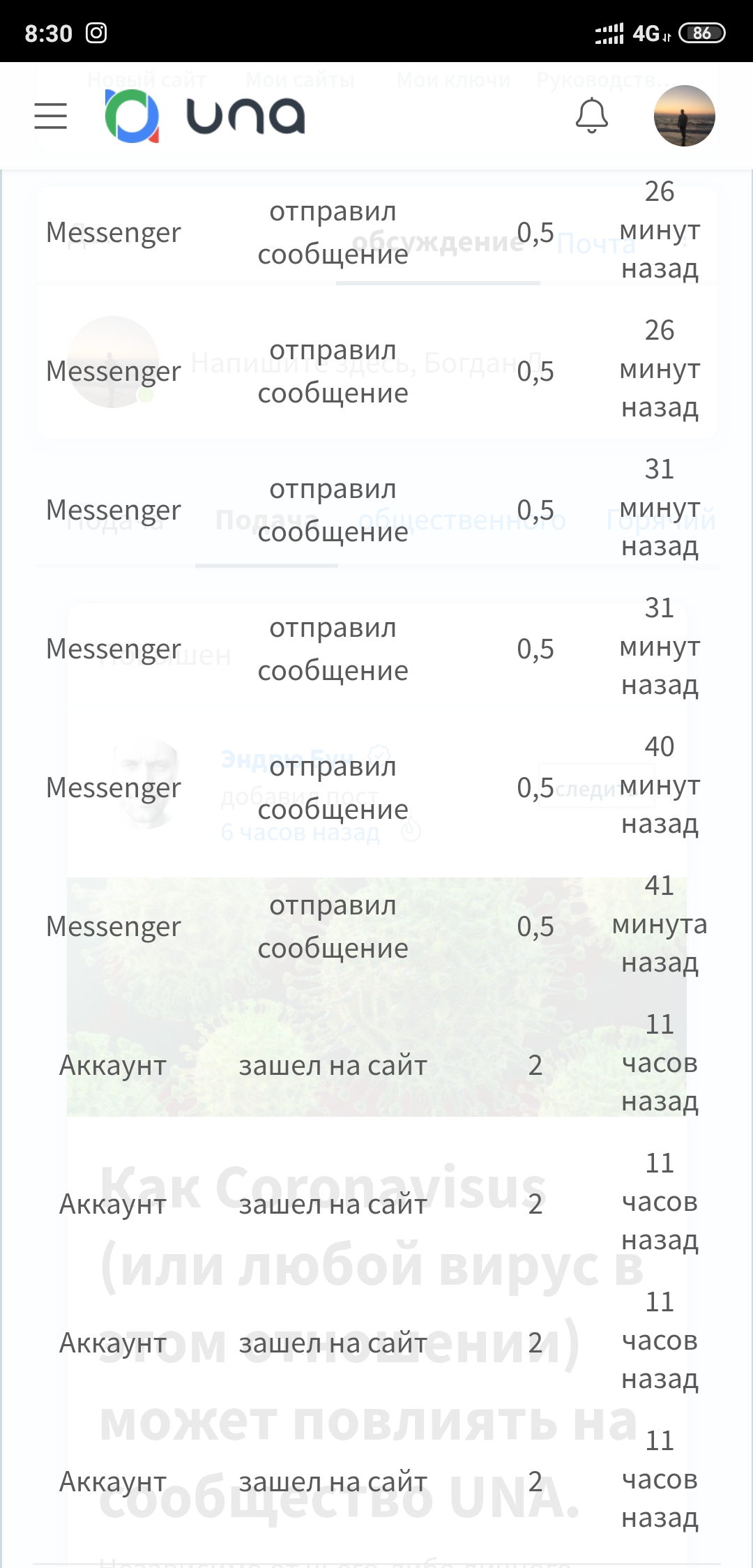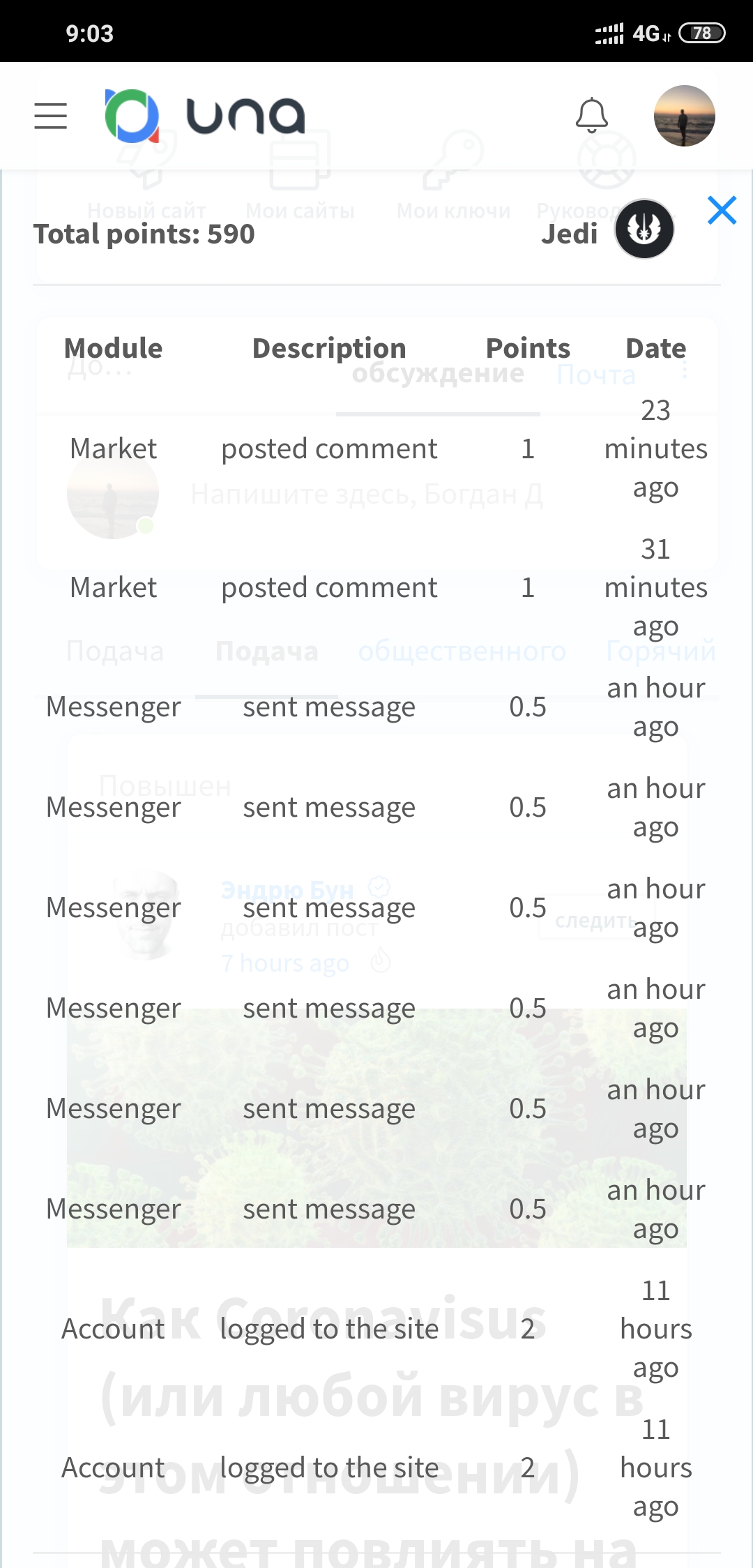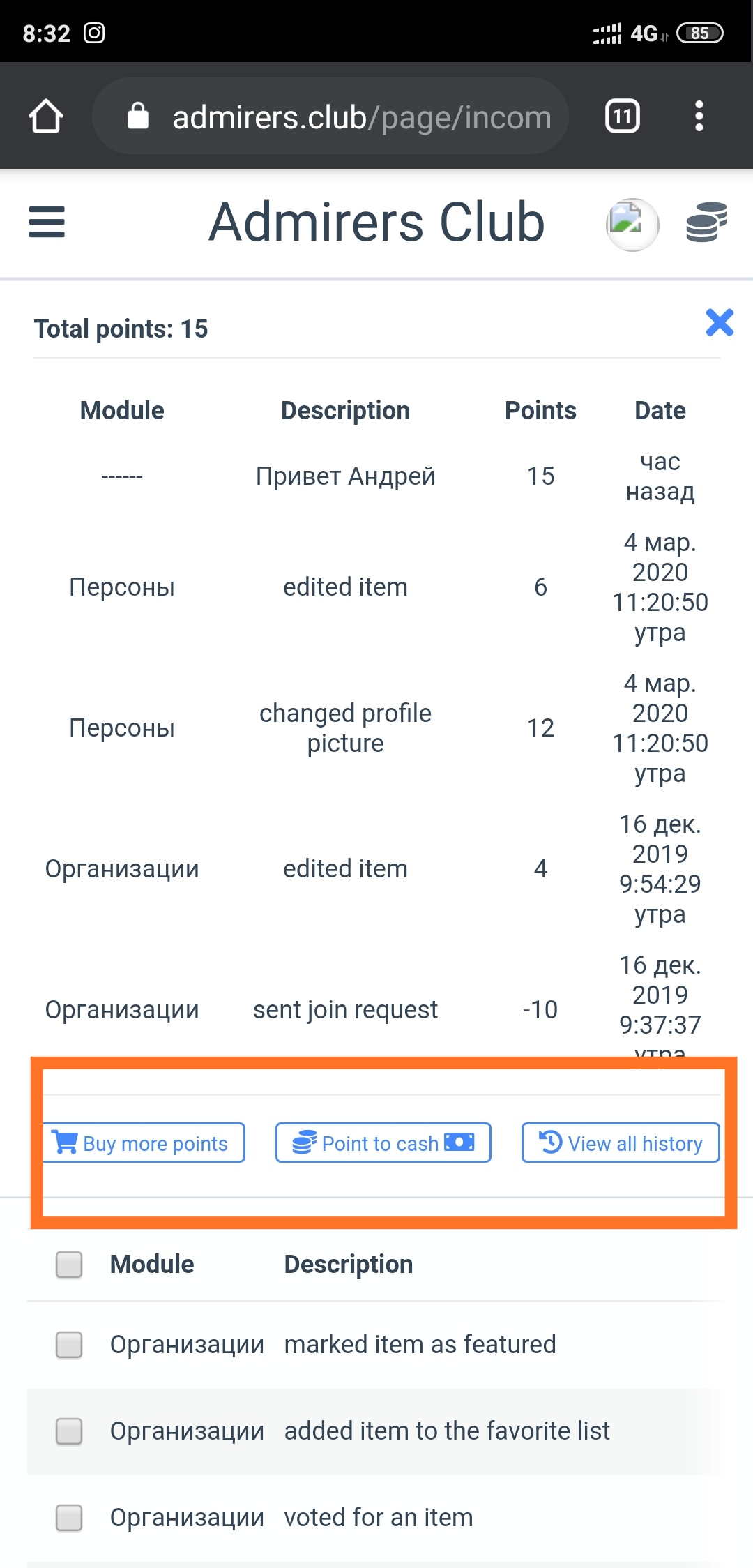 6) View site's notifications about just got/lost points using dropdown menu with details.