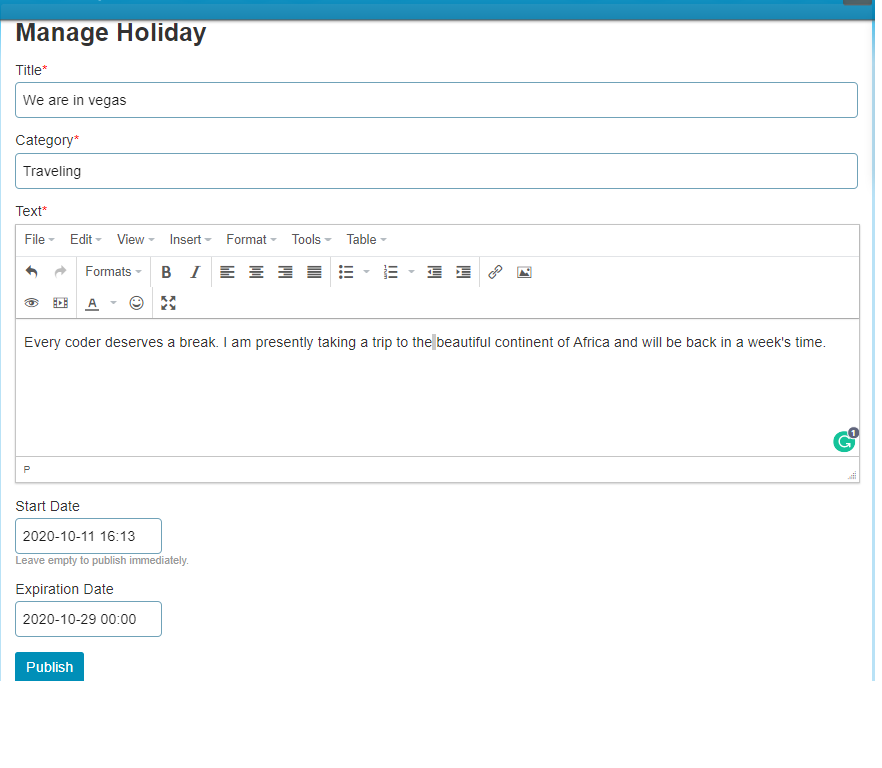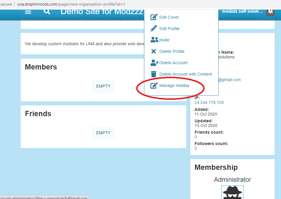 On the Profile page, there is an action in the menu that allows members to setup a message and activate it. In addition to the message, a member can also state a reason for the message (eg, promotion, vacation, study leave etc.). The reasons are configurable by the Administrator.