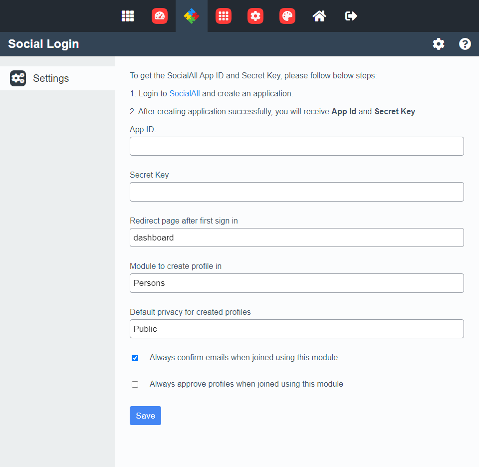 - Open Una Studio, select the Social Login module to open the Settings page.