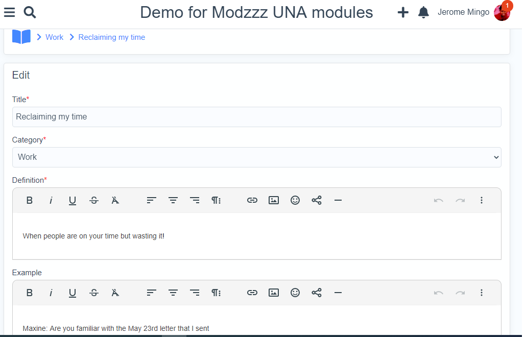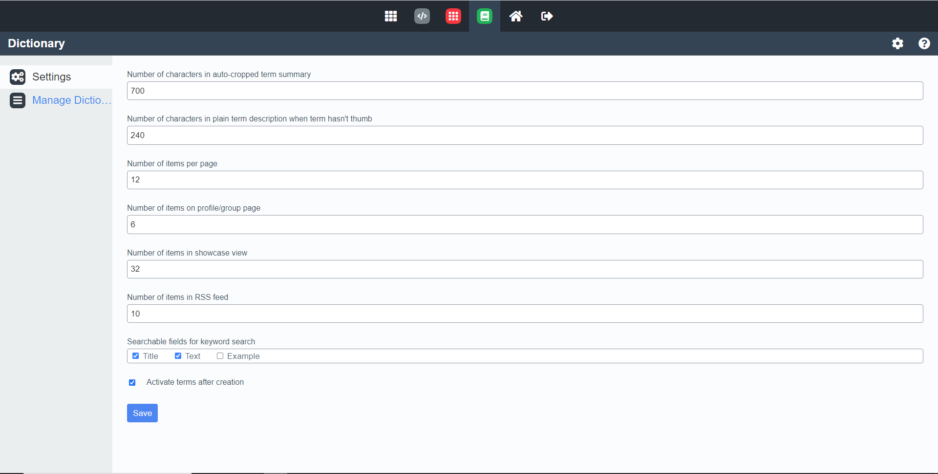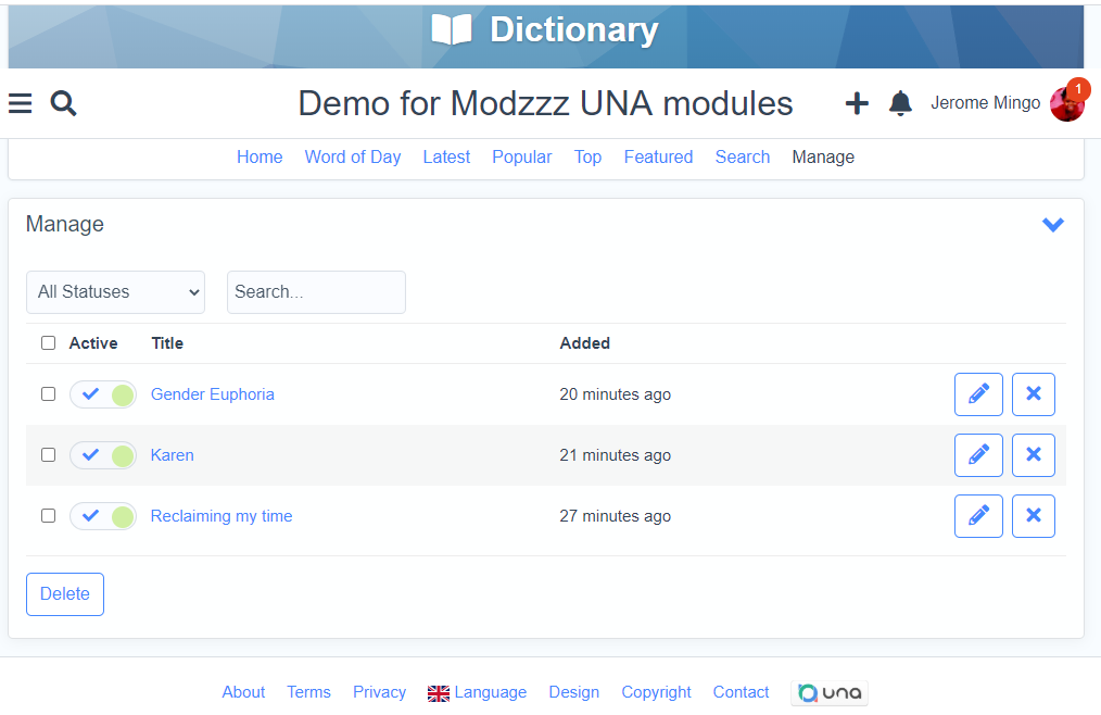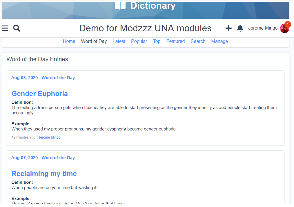 Dictionary is similar to Glossary with extended features. It is a Web-based dictionary (think urbandictionary.com) of slang words and phrases. This is a dictionary that your members will write. The definitions are meant to be those of slang or subculture words or words not found in standard dictionaries. Words can have multiple usage so the same word/word may be submitted by multiple members with varying definitions.