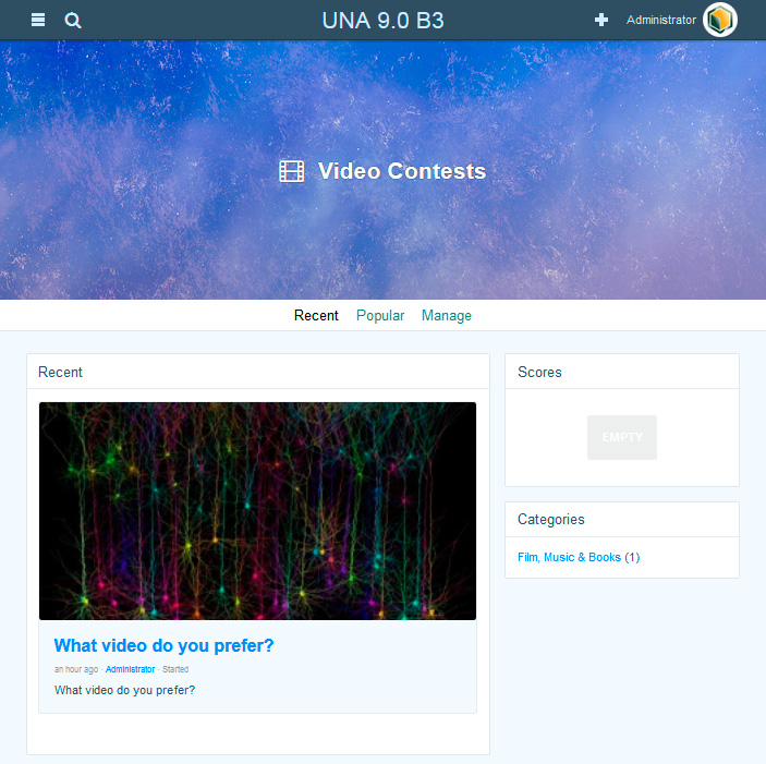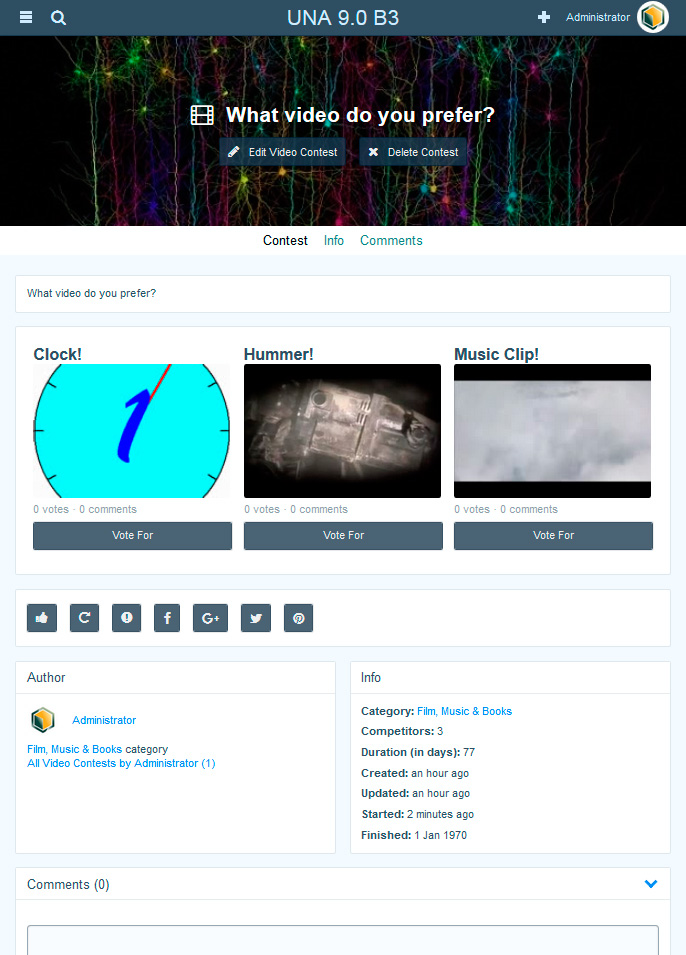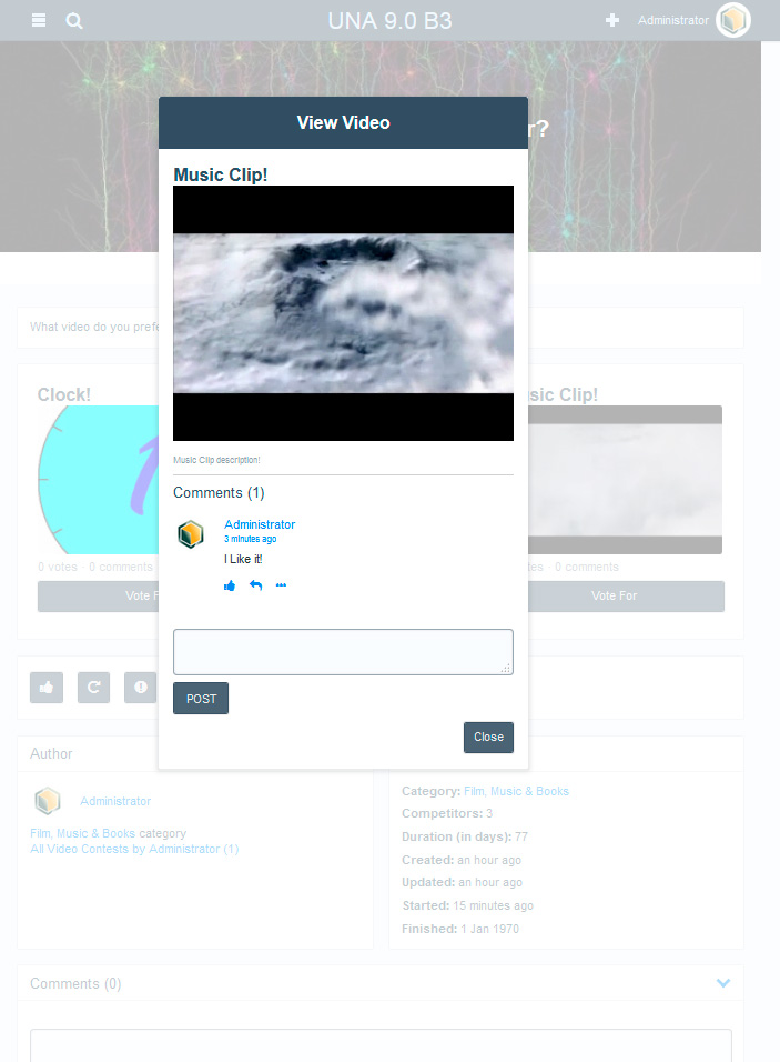 The App adds a new interesting feature on your site. It will allow your users to create video contets. Contest author may not take part in the competition, but if he wants he can became a one of the competitors. A contest may have 2, 3 or 4 competitors. The max number of competitors for the contest is selected by its author during the creation. A contest automatically starts when necessary number of competitors was collected. When contest was started the other site members may vote and/or comment for contest's videos. During the contest creation the author should select its duration (in days). The duration starts to decrease immediately after the contest collected necessary number of competitors (started). When duration ends the contest will be automatically finished and competitors collect their scores. Main features: