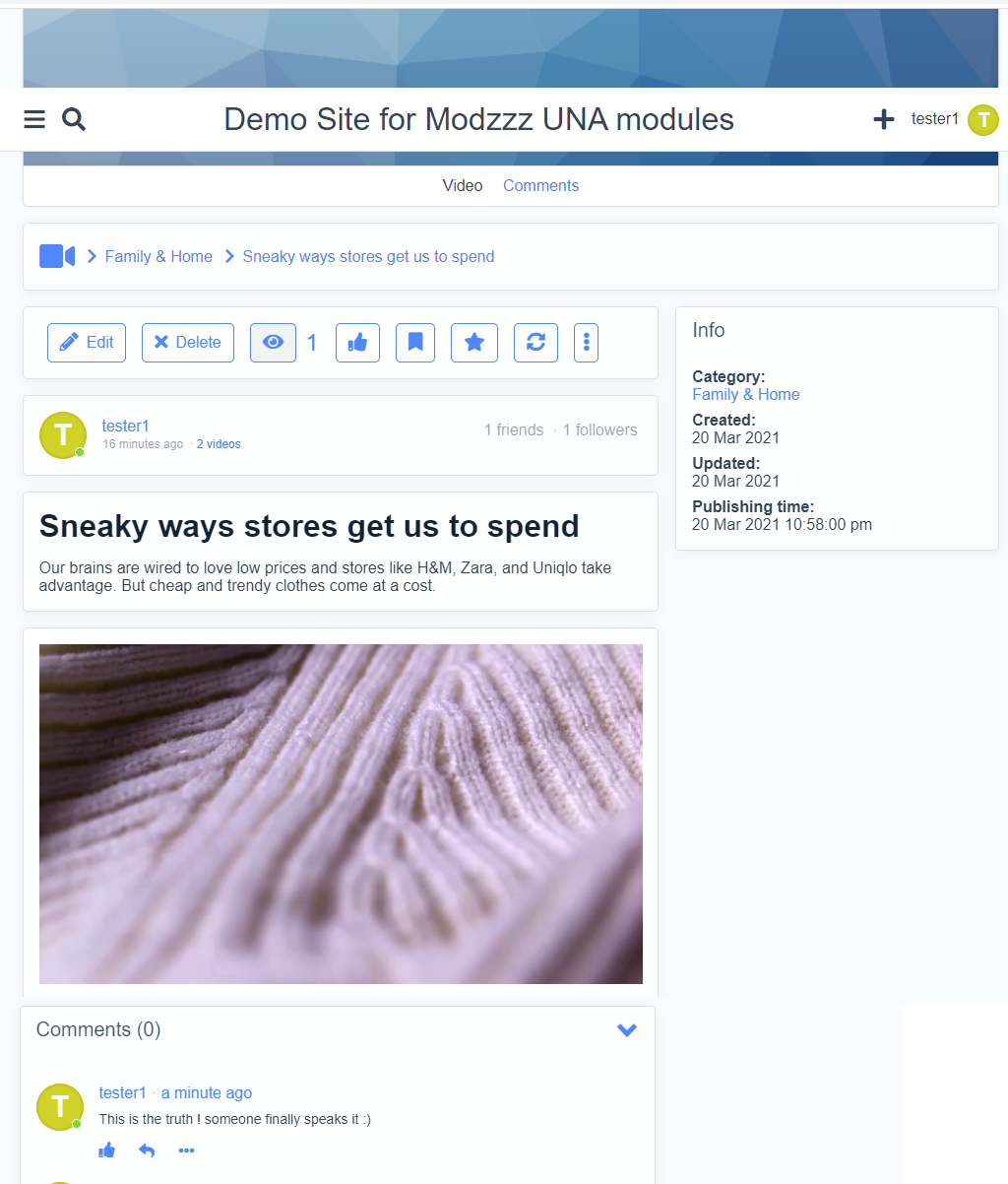 I requested for a mod that could embed videos so our site could use video sharing platforms for storage and delivery to reduce server load. I was quite surprised when he contacted me about 2 weeks later and say it would be on UNA''s app market that afternoon. I promptly purchased, downloaded and installed. It has performed well and I was surprised in the additional features for YouTube and a few other platforms that that their embed Iiframes could not be inserted without modification of script.